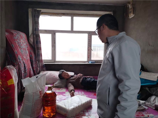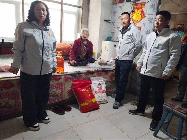 在一位瘫痪卧床的老人家中,成员们俯下身,耐心倾听老人的话语,将物资整齐摆放在床边的炕沿上,关切的眼神和温暖的话语,让老人的脸上露出了久违的笑容。在一间老旧的土坯房前,团队成员们与一位独居老人并肩而立,地上摆放的慰问物资,是他们最朴实的关怀。老人握着成员们的手,不停地说着感谢,眼角泛起了泪光。
